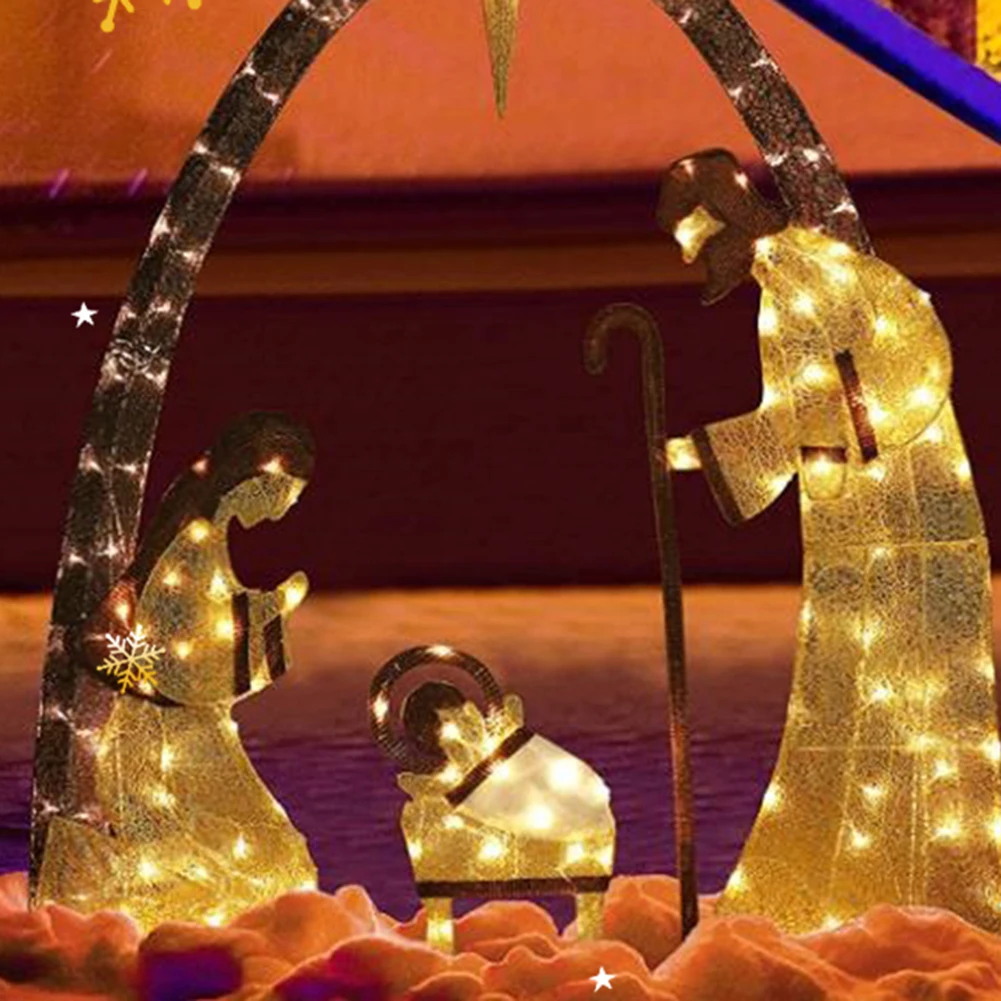 3. Elegant Symbolic Design: Adorned with a star above the outline, this decoration beautifully depicts the gathering of Mary and Jesus under an arch, capturing the essence and spirit of Christmas. The warm yellow bulbs add a cozy festive touch, illuminating your New Year's wishes.